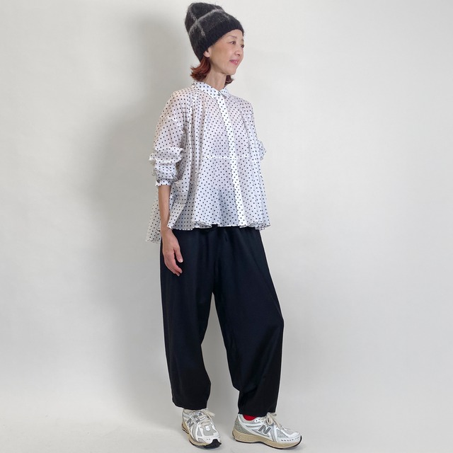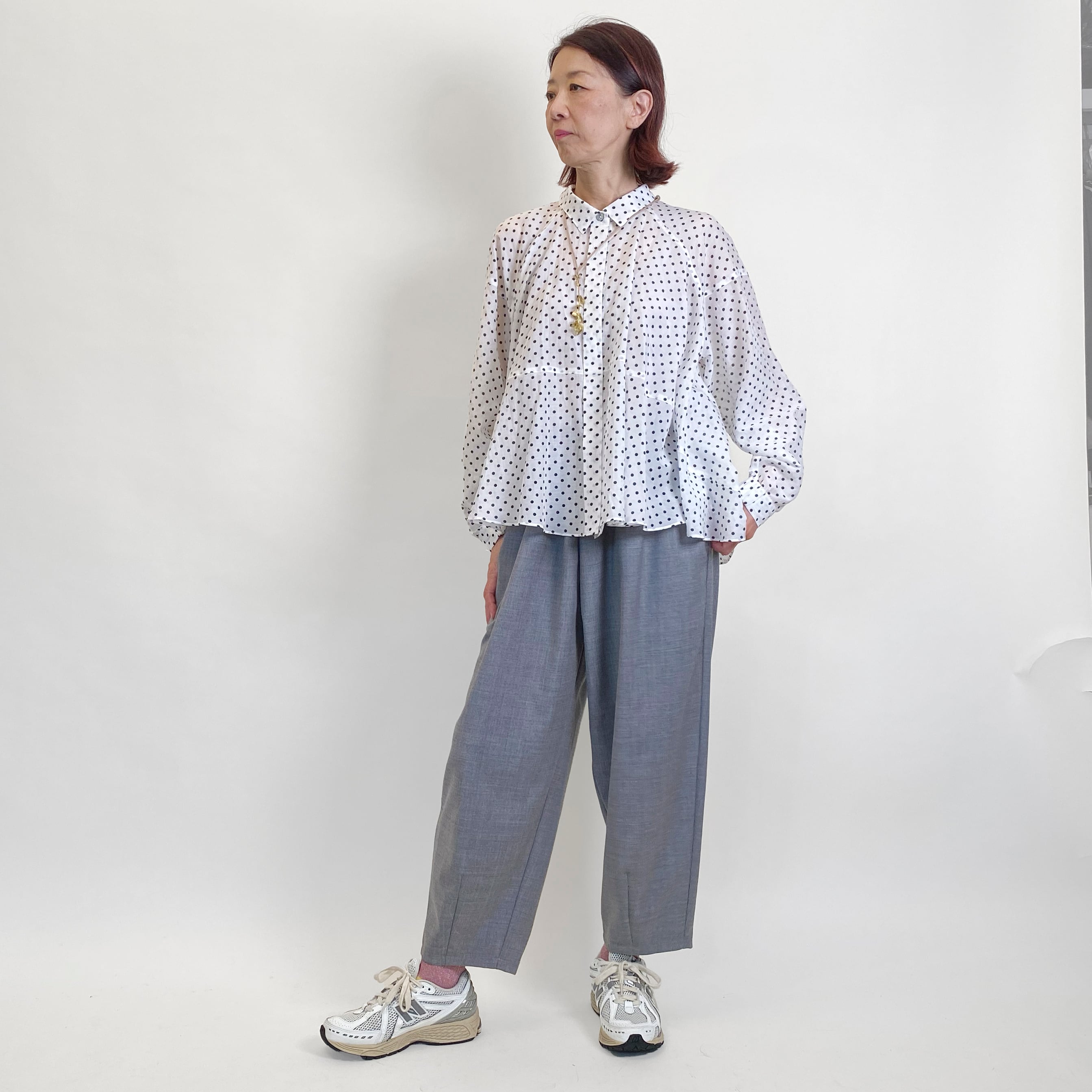 ビッグシルエットのブラウス。ドット柄のコットンシルク素材をヨークでたっぷりと切り替えて、贅沢に使用。分量感たっぷりなのにとても軽くてまるで着ていない様な着心地の良さです。