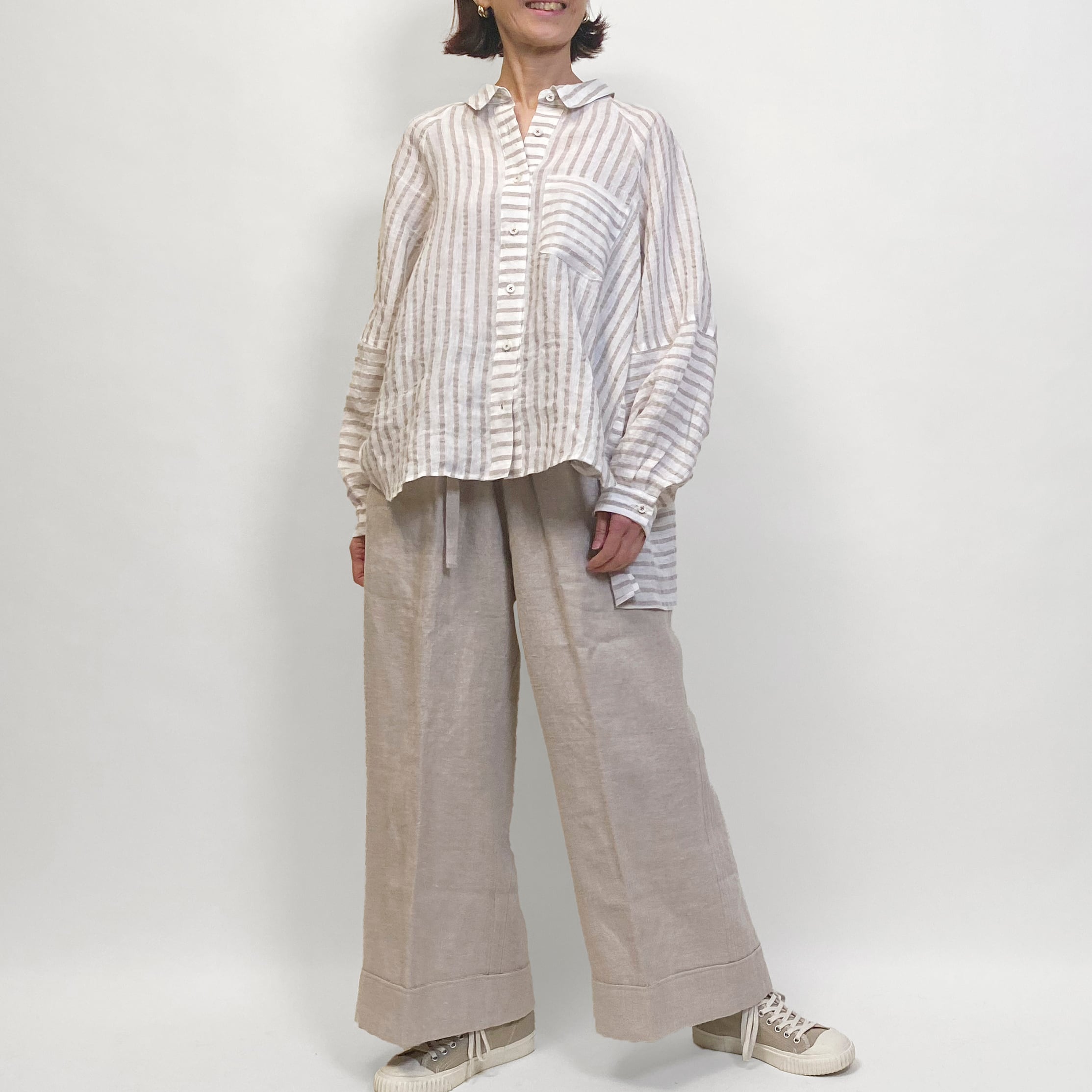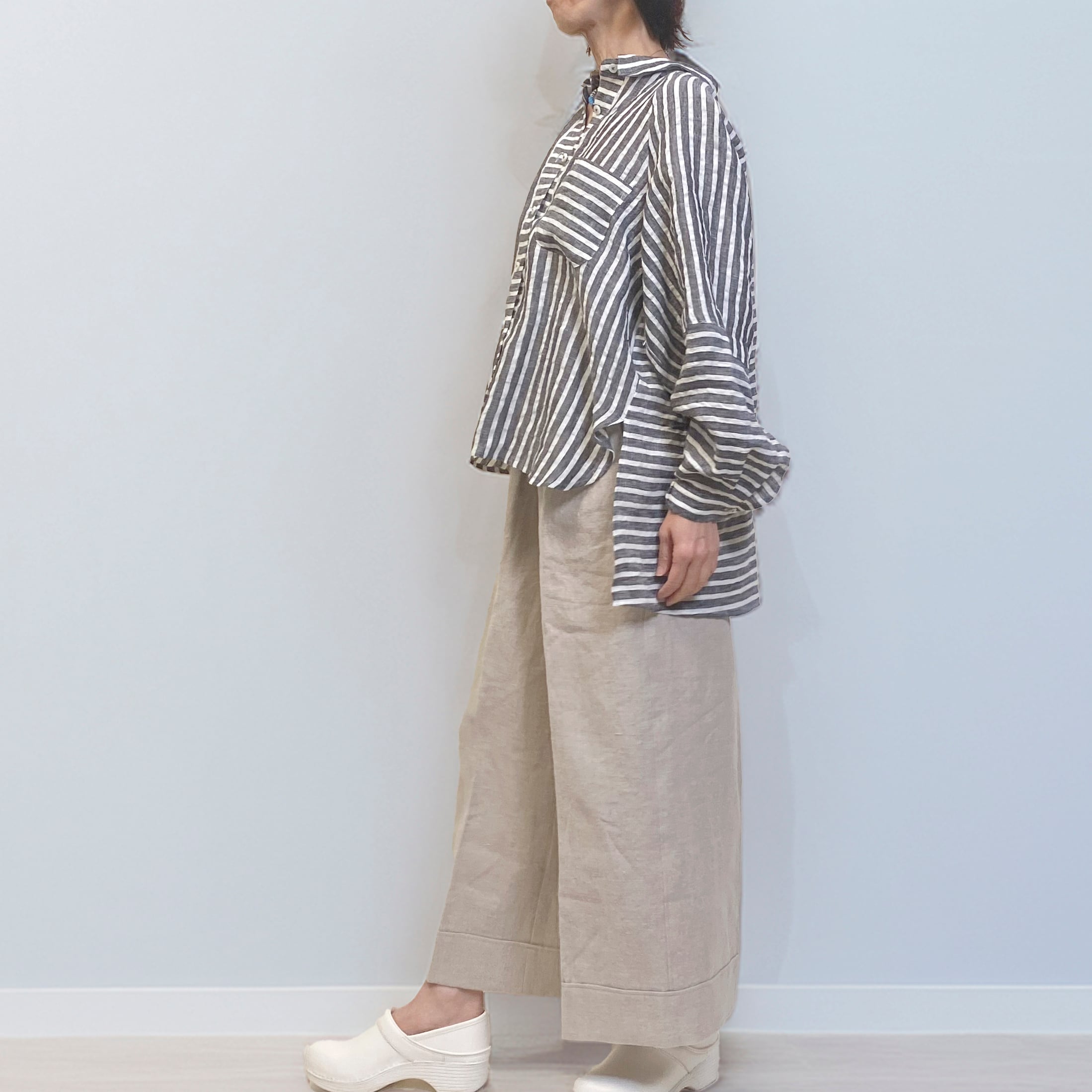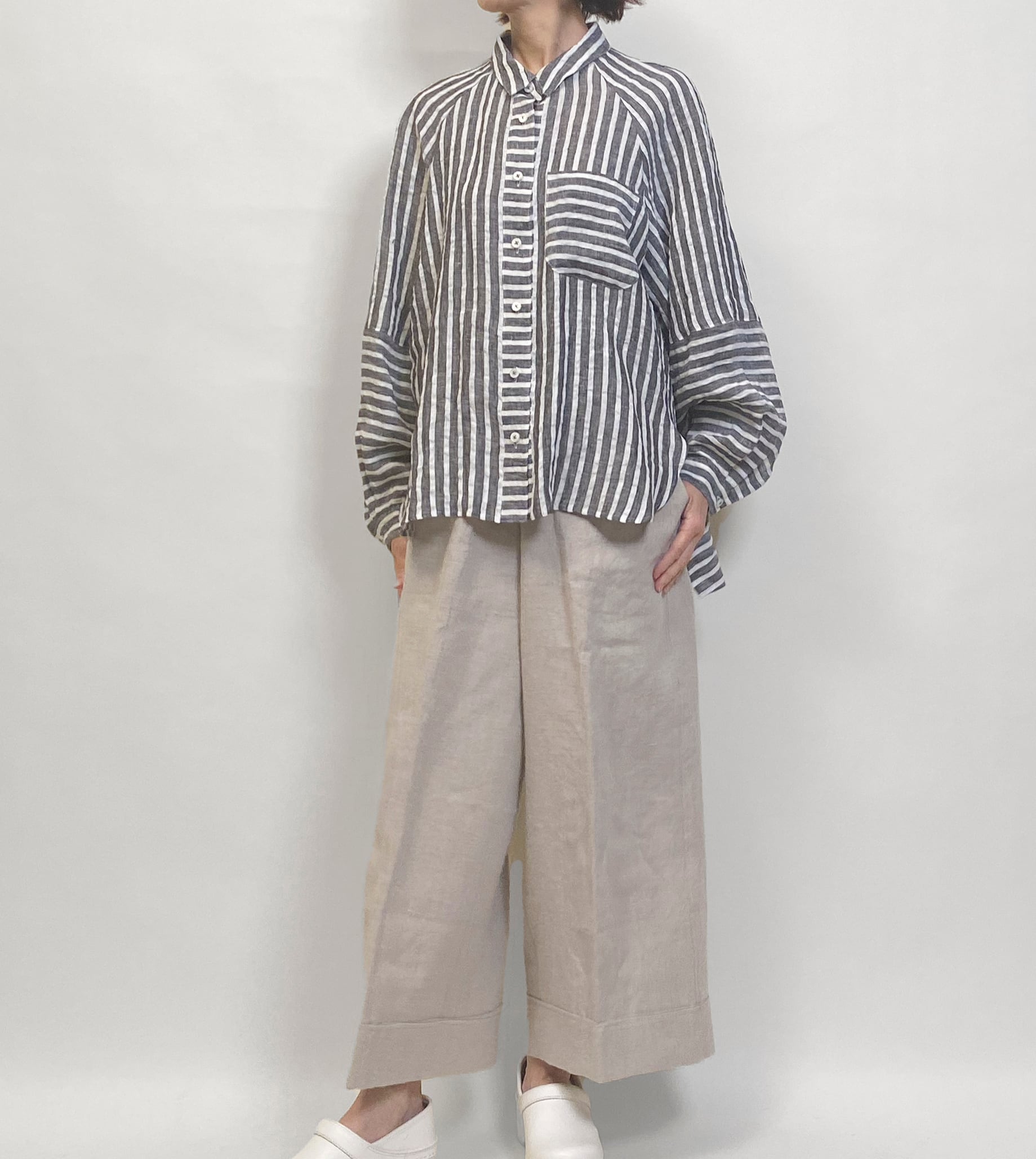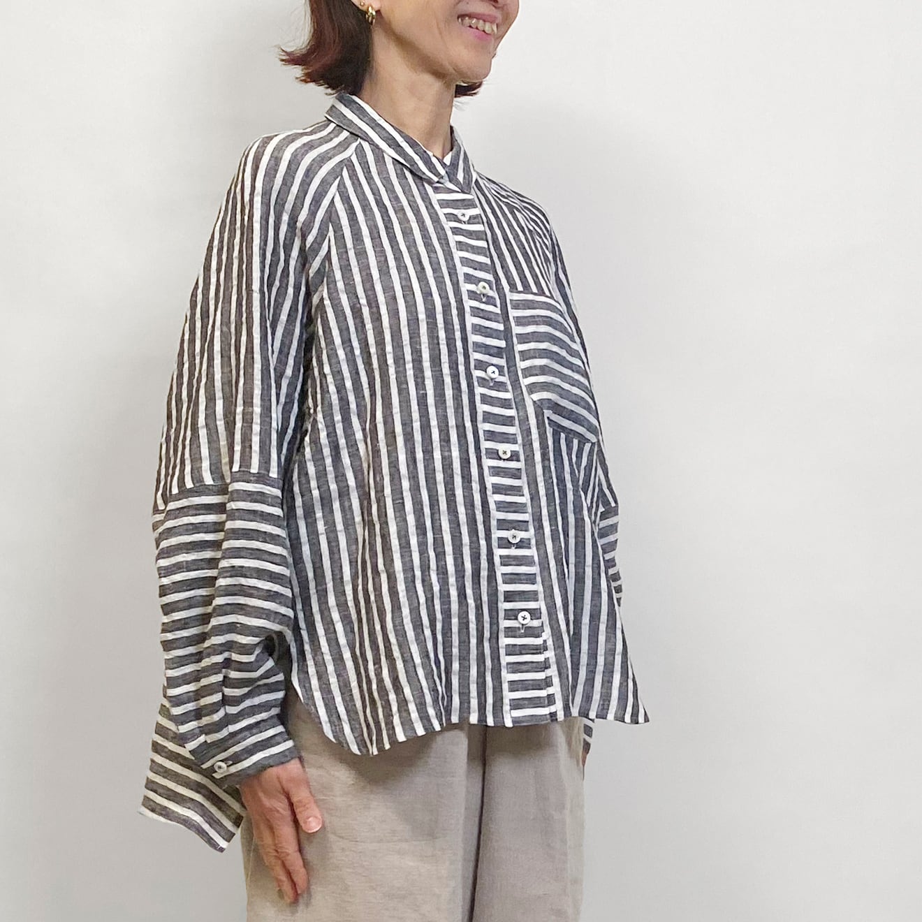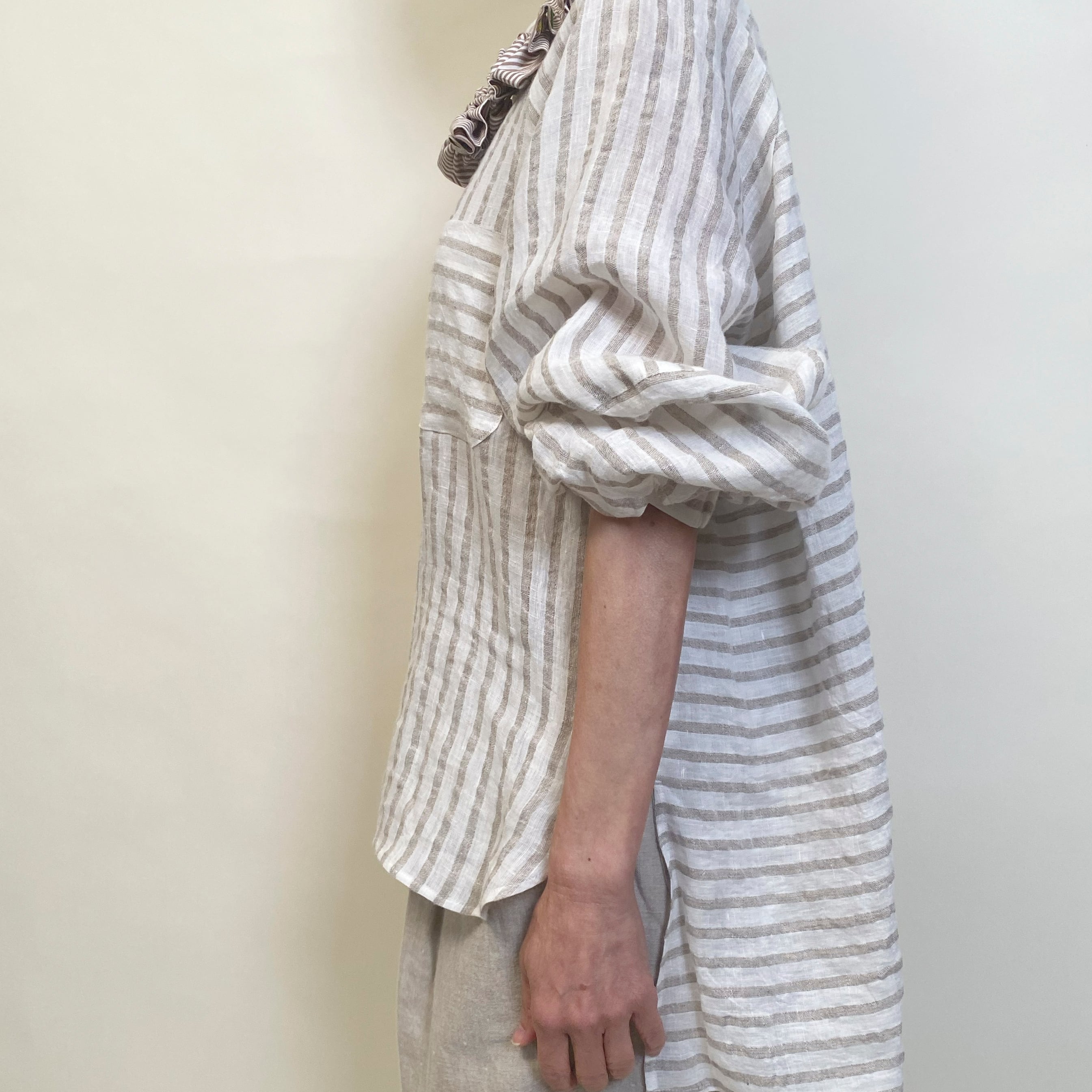 ゆったりとしたリネンストライプのブラウス。切り替えで楽しさを表現しました。