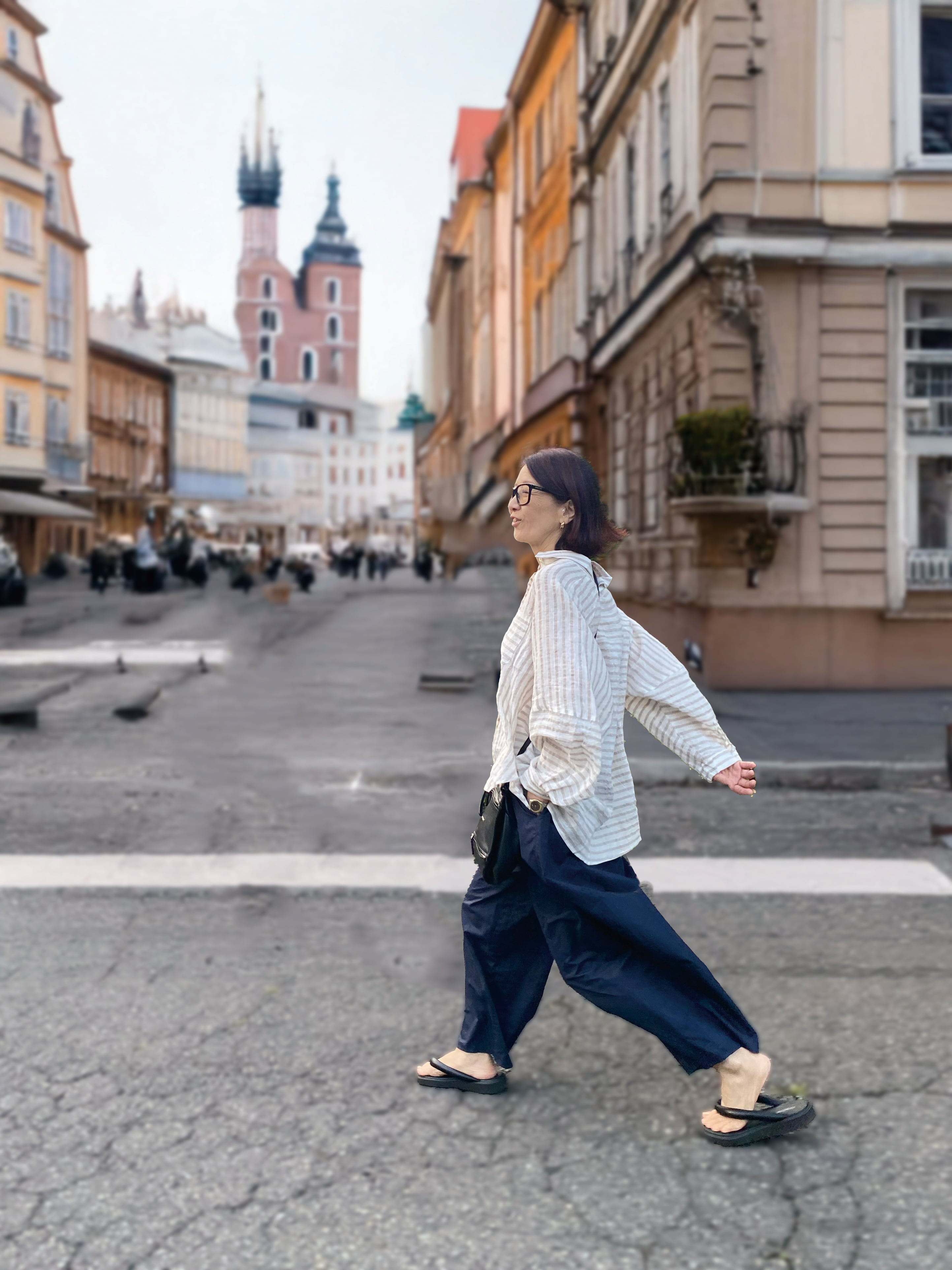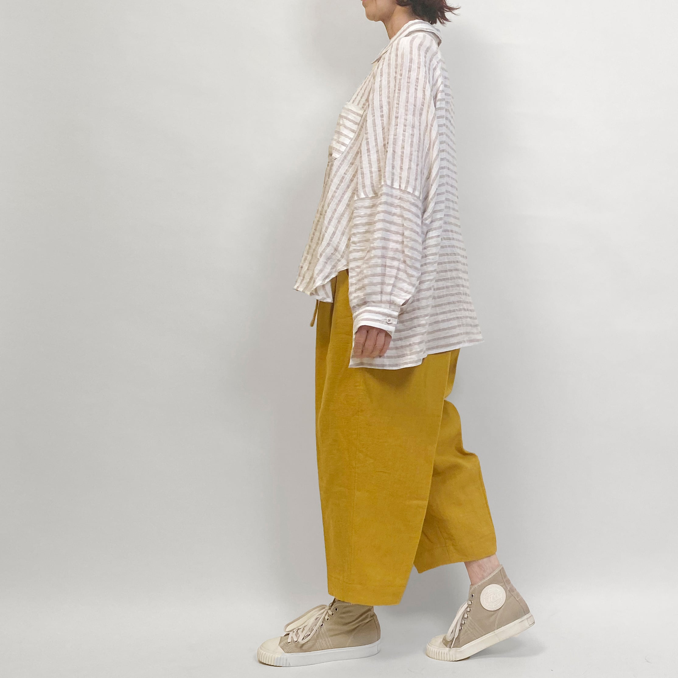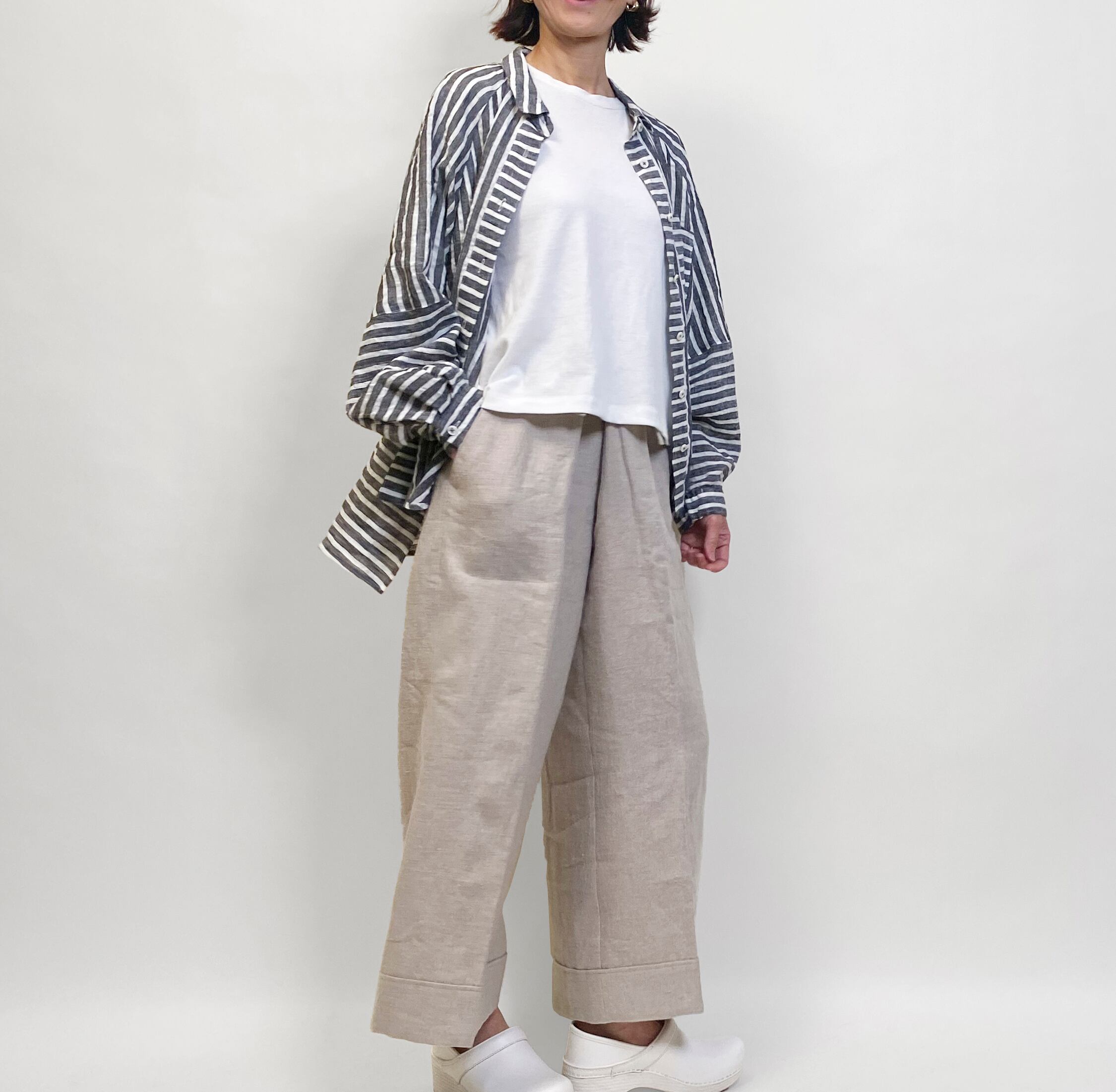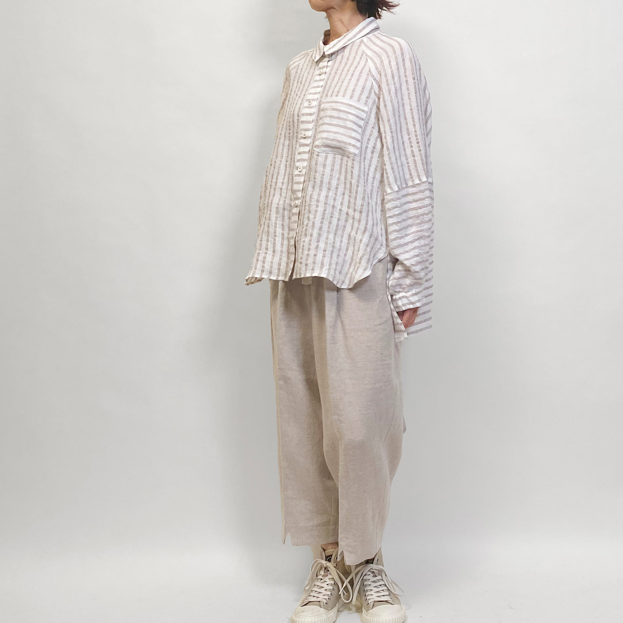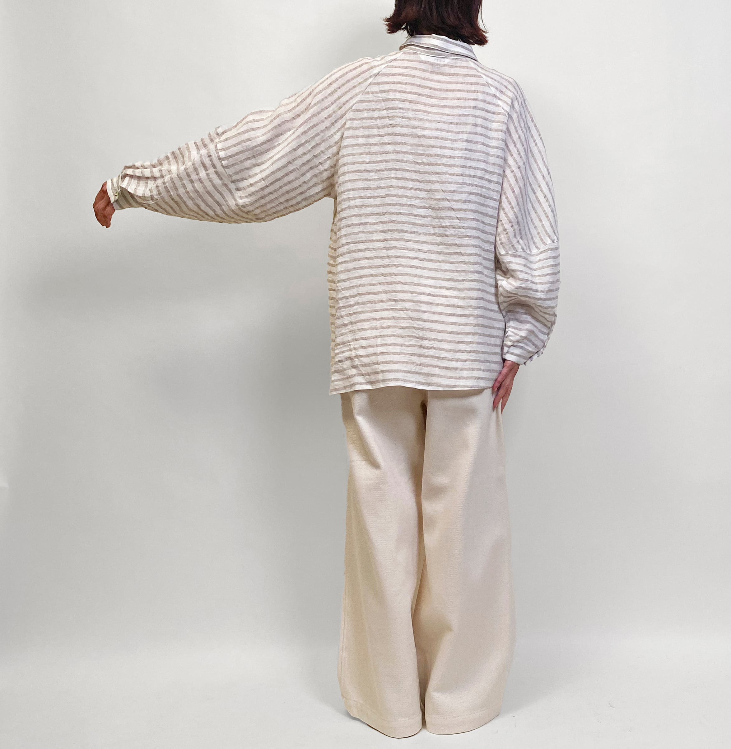 ゆったりとしたリネンストライプのブラウス。切り替えで楽しさを表現しました。