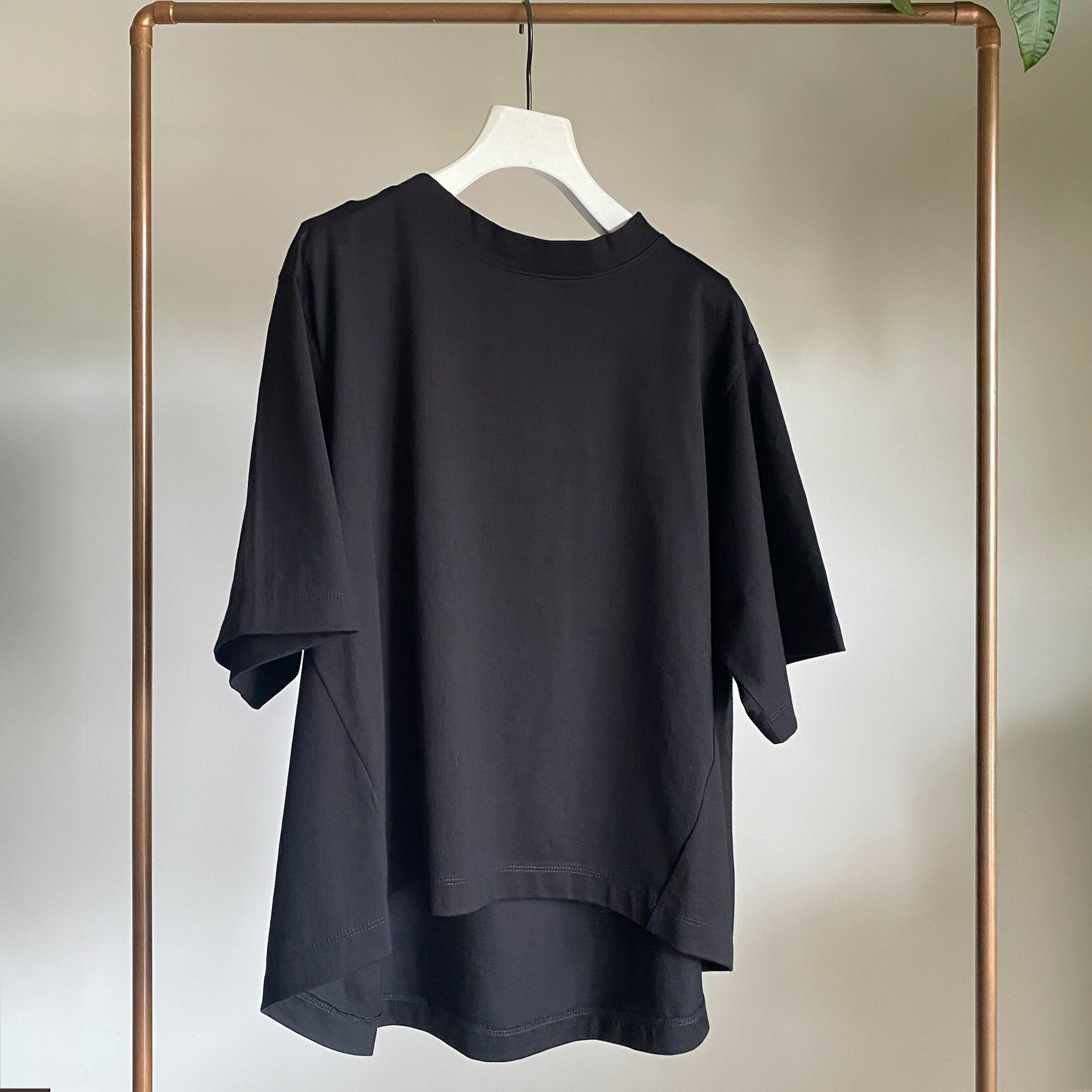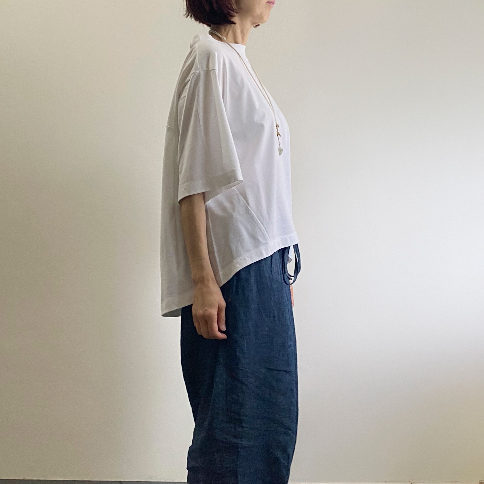 肘を隠す袖の長さと前後で長さを変えた裾が特徴。襟幅は太めのでカジュアルになりすぎず、幅広いシーンで活躍できるデザインになっています。