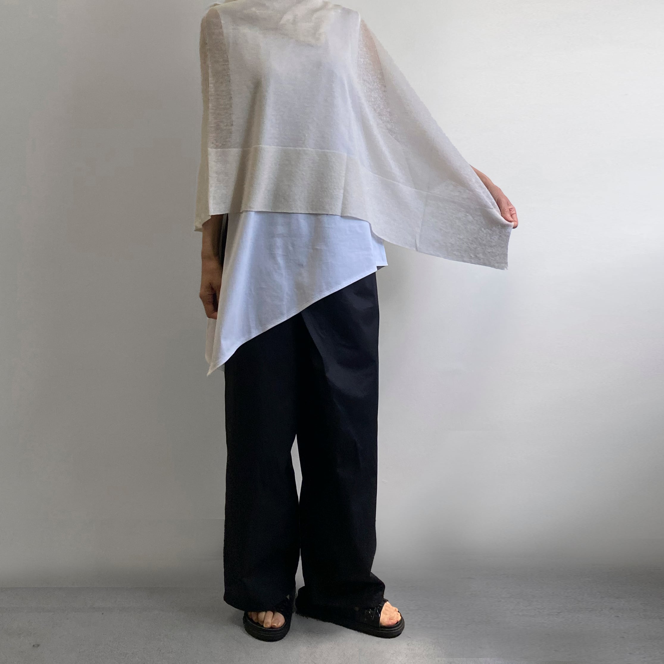 合わせの生地の部分はウエストがもたつかないよう分量感を計算し、奥の生地を少し引き上げることでスッキリと履いていただけるようになっています。